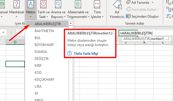 BİRLEŞTİR (ARALIKBİRLEŞTİR) fonksiyonu METİN fonksiyonları altında kategorize edilir.