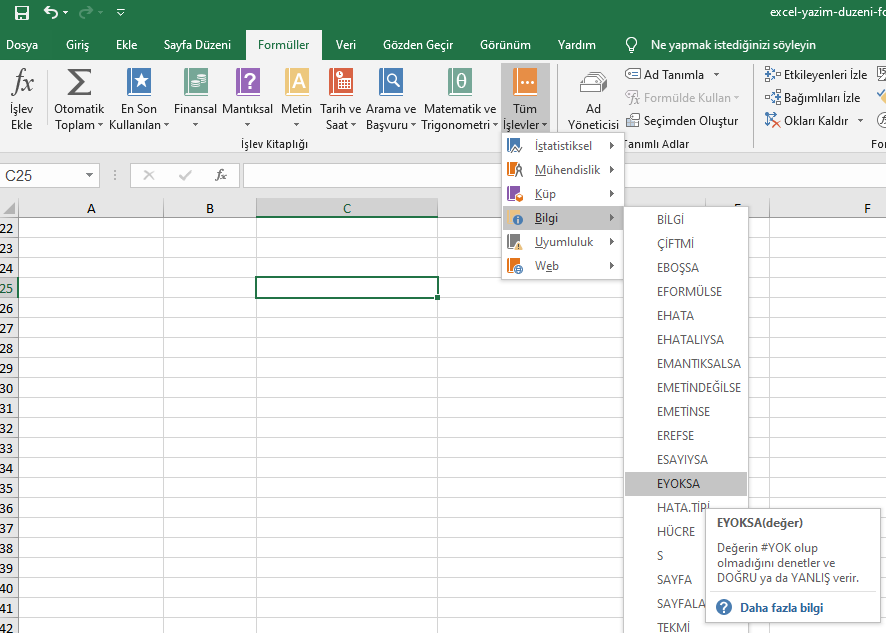 EYOKSA BİLGİ fonksiyonları altında kategorize edilir. Formüller Sekmesinde Tüm İşlevler Altındaki BİLGİ grubundadır.