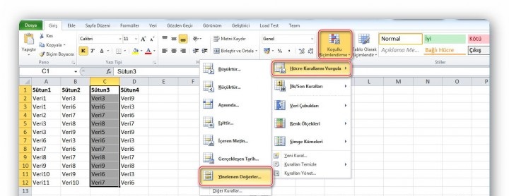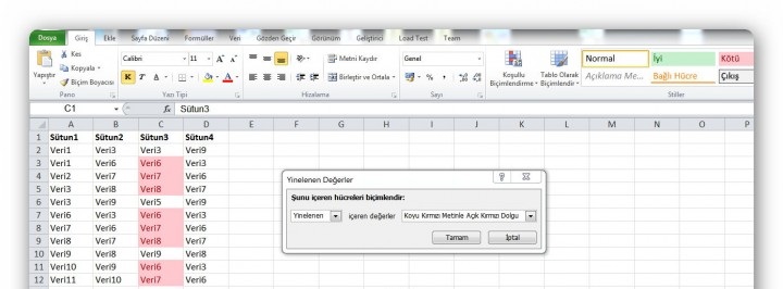 Yukarıdaki örnekte ben yalnızca bir sütun seçtim.İsterseniz tüm verileri seçebilir yada yatay olarak da tek satır seçebilirsiniz.Hücrelerimizi seçtikten sonra şerit kısmında “Koşullu Biçimlendirme” butonunun altında bulunan “Hücre Kurallarını Vurgula” seçeneğinin içerisinde bulunan “Yinelenen Değerler” butonuna tıklıyoruz.