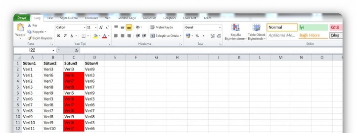 Özel Biçimlendirme ayarları yapıldıktan sonra yinelenen değerlerim aşağıdaki gibi işaretlendi.Sonrasında verilerimize renklerine göre filtre uygulayarak silme işlemi yapabiliriz.
