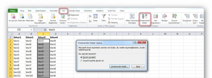 Geçerli seçim ile devam et: Burada ise yalnızca seçtiğimiz hücrelerde yinelenen değerleri kontrol eder.