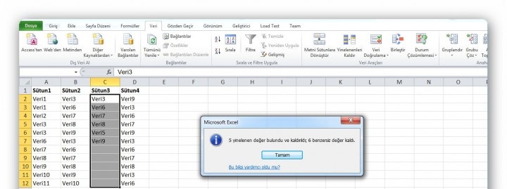 Ben yalnızca seçtiğim hücrede işlem yapılmasını istiyorum.Bu yüzden “Geçerli seçim ile devam et” seçeneğini işaretleyip yinelenenleri kaldır butonuna tıklıyorum ve yalnızca seçtiğim hücrelerden tekrarlayan değerleri kaldırdı.