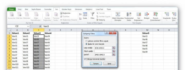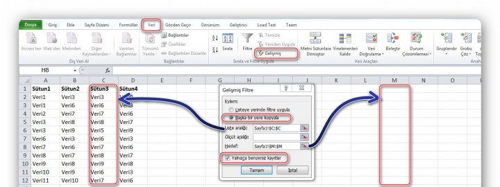 Diğer yollara göre biraz daha karmaşık bir kullanımı vardır.Şerit kısmından “Veri” sekmesi altında “Filtre” butonunun hemen sağ alt tarafında bulunan “Gelişmiş” butonun tıkladıktan sonra karşımıza çıkan pencereden verilerimizin bulunduğu yeri ve yeni kopyalamak istediğimiz yerleri seçiyoruz.