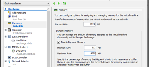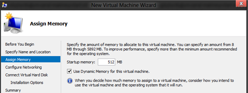Yeni bir vm oluşturken makine için RAM miktarını ayarlayabiliyoruz. Bu makineyi başlattığımda 512 MB RAM makine tarafından reserver edilecek ve bu makine tarafından kullanılmaya başlanacak. Bu da demek oluyor ki RAM havuzumdan 512 Mb azalacak. HyperV 2 üzerinde bunun anlamı vm’i başlatmadan vm ayarlarından Dynamic Memory değerlerini düzenlememiz gerektiğiydi.
