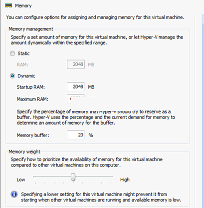 HyperV 2 üzerinde vm kapalı durumdayken RAM kullanımını static olarak ya da dynamic olarak belirleyebiliyoruz. Ancak iki seçeneği bir arada kullanma şansımız bulunmuyor.
