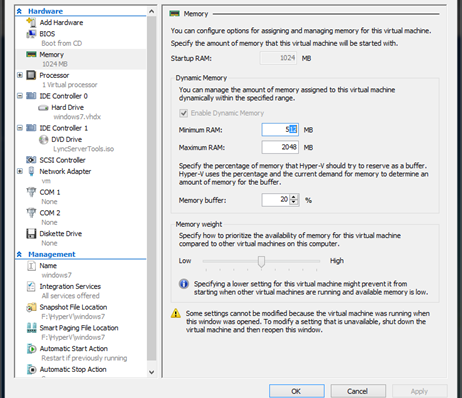Oysa HyperV 3’te aynı ekranda Use Dynamic Memory for this virtual machine ile Dynamic Memory seçeneğini bu ekranda aktifleştirebilme imkanımız bulunmaktadır.