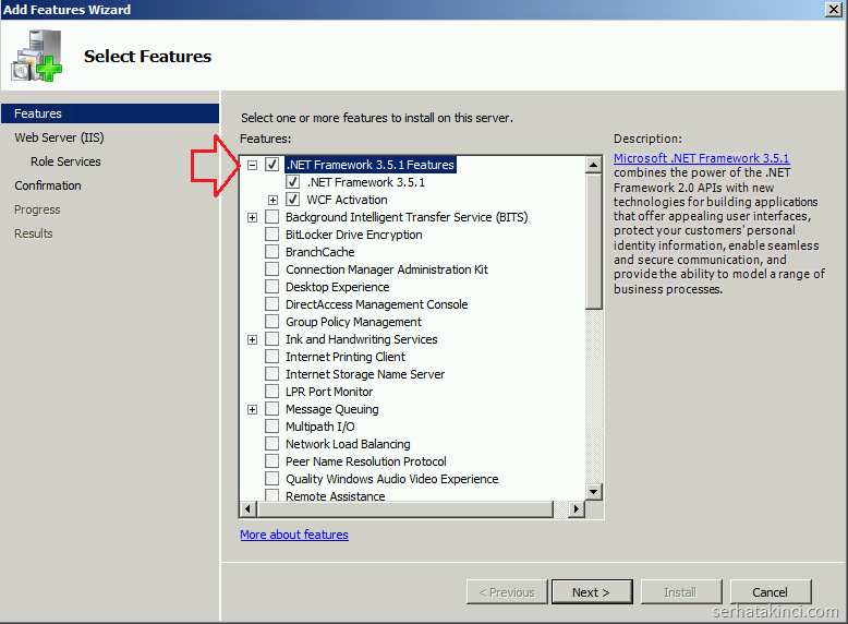 Eğer Windows Server 2008 R2 sürüm bir işletim sistemini hazırlıyorsanız .Net Framework 3.5’i aktif etmek için Server Manager > Features > Add Features yolunu takip ederek .NET Framework 3.5 Fetautes’ı aktif edin. Ayrıca gereken .Net Framework 4.0 veya 4.5‘i ise siz indirip yükleyebilir veya bu işi yine SQL Server Setup kurulum programına bırakabilirsiniz.
