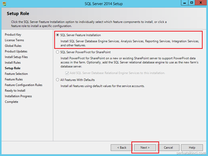 Yukarıdaki pencerede, SQL Server 2014 kurulumunu özel bir amaç için yönlendirmeniz mümkün. Genelde ilk seçenek tercih edilerek ilerlenir.