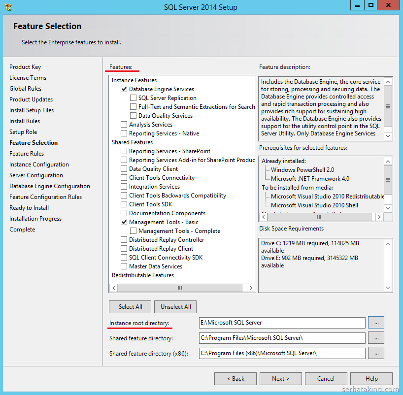 Feature Selection adımındaki Instance Features ve Shared Features seçeneklerinden hangilerini yüklemeniz gerektiği, genelde bu sunucu üzerindeki veritabanlarını ve servisleri kullanacak uygulamaların ihtiyacına göre belirlenir. Örneğin her uygulama Analaysis Services veya Integration Services özelliklerine ihtiyaç duymayacaktır. Bu noktaya ayrıca dikkat etmenizi öneririm.