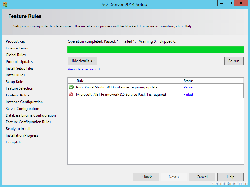 SQL Server Setup’ı başlatmadan önce .Net Framework 3.5 SP1 kurulumunu yapmadıysanız yukarıdaki hatayı alırsınız. Eğer Microsoft .Net Framework 3.5 Service Pack 1 is required hatasını alırsanız, bu pencereyi (yani SQL Server Setup penceresini) kapatmadan gidip .Net Framework 3.5 SP1 kurulumunu gerçekleştirebilir, daha sonra bu pencerede Re-run diyerek önce kontrolün sonra da kurulumun devam etmesini sağlayabilirsiniz.