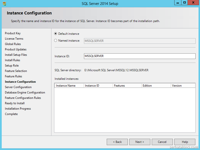 Instance Configuration adımında SQL Server 2014 instance için bir isim verebilir veya Default instance seçimiyle ilerleyebilirsiniz. Eğer özel bir gereksinim yoksa önerim ve genel kabul Default Instance seçimiyle ilerlemektir. Örneğin daha sonra bu sunucu üzerine ikinci Instance kurulumu yapanız gerekirse mecburen Named Instance seçeneğini tercih edeceksiniz.
