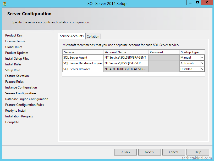 Server Configuration adımında, daha önce seçtiğiniz fetaure’lara göre belirlenen SQL Server servislerinin hangi hesaplarla çalışacağını ve başlangıç durumlarını belirleyebilirsiniz. Eğer bir servisin örneğin domain hesabı ile çalışmasına ihtiyacınız varsa, doğru yapılandırılmış bir domain hesap bilgisini bu aşamada servise atayabilirsiniz.
