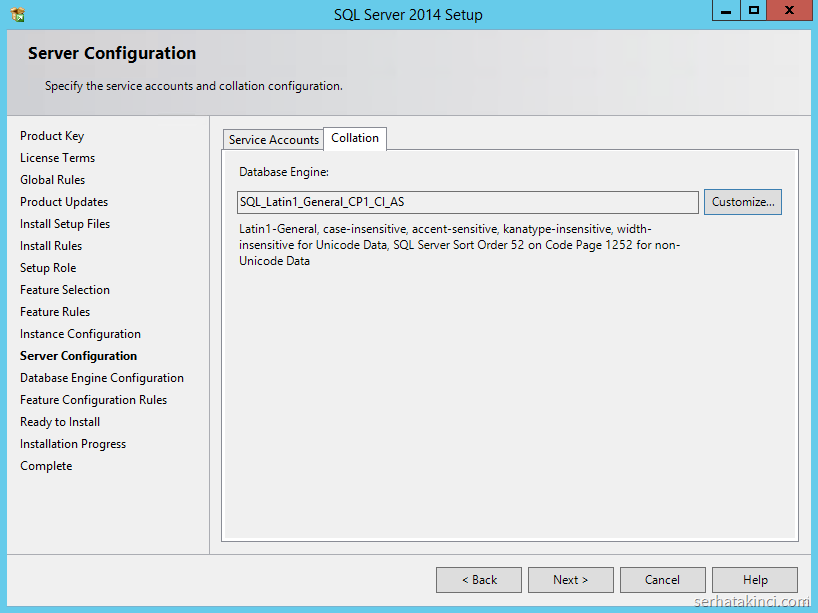 Yine aynı pencerenin diğer tab’ında ise Collation ayarı bulunur. Database Engine için Collation, genellikle veritabanları içinde tutulacak veriye veya uygulamaya göre belirlenir. Örneğin bu sunucu üzerindeki veritabanları içerisinde Türkçe karakterlerin de yer alacağı verileri tutacaksanız, ş ç ü ğ gibi karakterleri de destekleyen SQL_Latin1_General_CP1_CI_AS Collation seçeneğini tercih etmelisiniz.