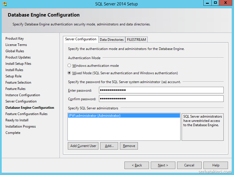 Database Engine Configuration adımında, SQL Server 2014 Database Engine servisine yönetici olarak erişirken kullanılacak kimlik doğrulama (Authentication) yöntemi belirlenir.