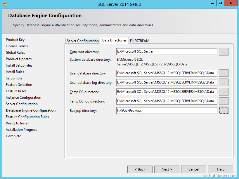 Database Engine Configuration penceresinin diğer tab’ında veri, veritabanı ve yedek gibi içeriklerin bulunacağı varsayılan dizinler listelenir. Eğer isterseniz yolları değiştirebilirsiniz.