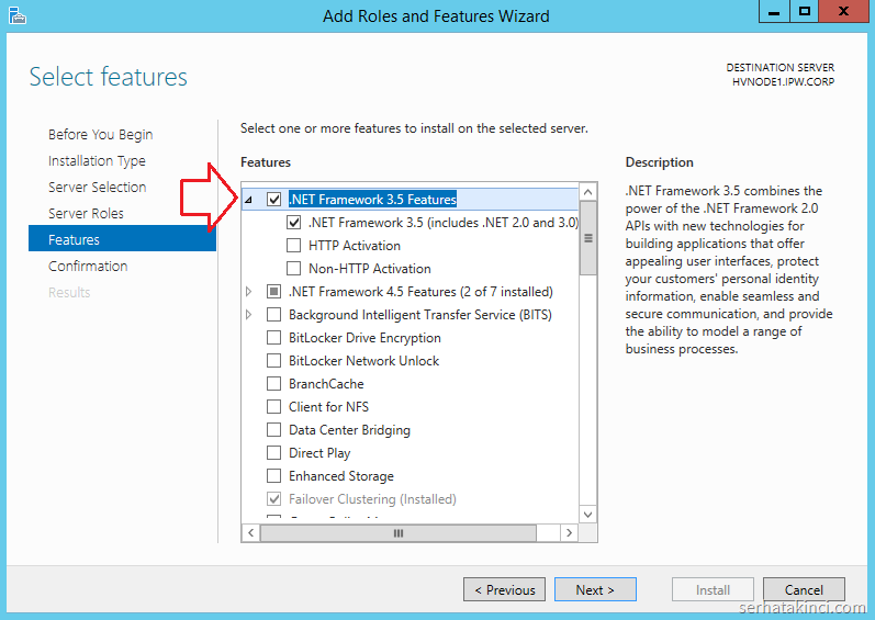 Eğer Windows Server 2012 veya 2012 R2 sürüm bir işletim sistemini hazırlıyorsanız .Net Framework 3.5’i aktif etmek için Server Manager > Add roles and features yolunu takip ederek Select Features bölümüne gidin ve .NET Framework 3.5 Fetaute’ı aktif edin. Ayrıca gereken .Net Framework 4.0 veya 4.5 zaten bu işletim sistemi sürümleri üzerinde önceden yüklü olarak gelir.