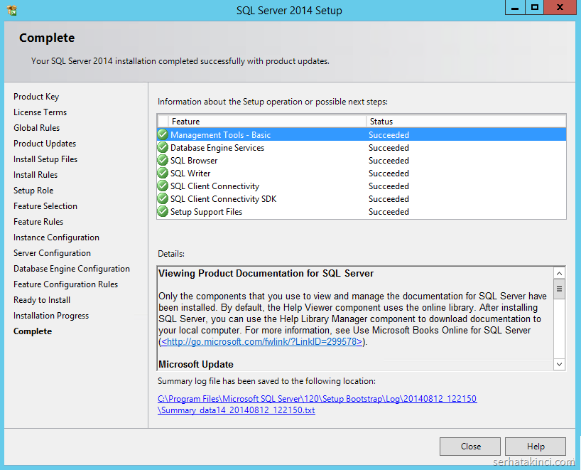 Ve SQL Server 2014 kurulumu yukarıdaki gibi tamamlanır.
