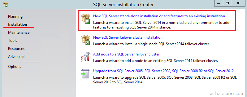 New SQL Server failover cluster installation seçimi yeni bir Failover Cluster yapısı kurarken, Add node to a SQL Server failover cluster seçeneği var olan bir Failover Cluster yapısına yeni bir Node dahil ederken, Upgrade from SQL Server 2005, 2008, 2008 R2 or 2012 seçeneği ise alt sürümden üst sürüme yükseltme yaparken tercih edilir.