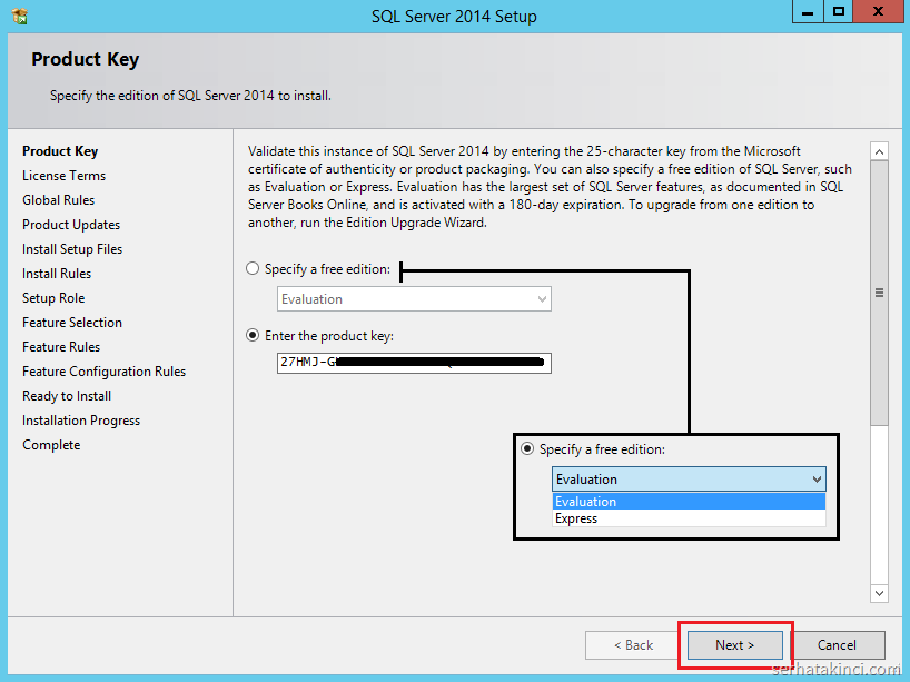 Varsa SQL Server sürümünü için uygun ürün anahtarını girin. Eğer bir ürün anahtarınız yoksa, deneme (Evaluation) veya ücretsiz sürüm (Express) seçeneklerinden birini tercih edin.