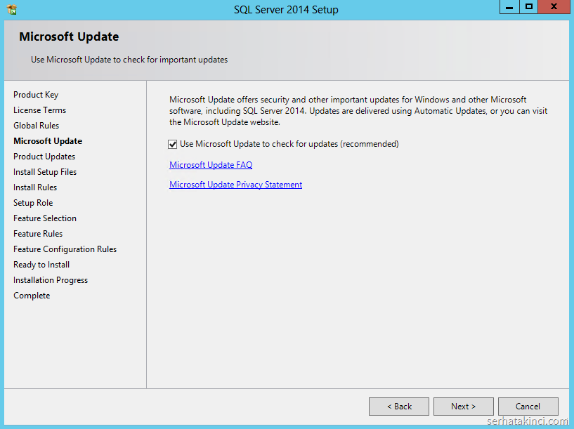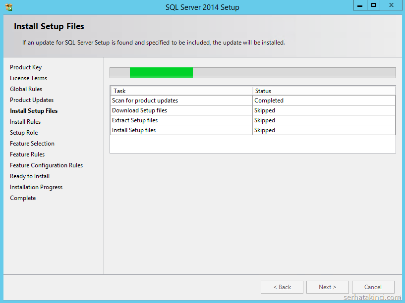 Yukarıdaki pencerede SQL Server Setup öncesi ürün güncellemeleri kontrol edilir, gerekli ise Setup dosyaları indirilir, açılır ve yüklenir.