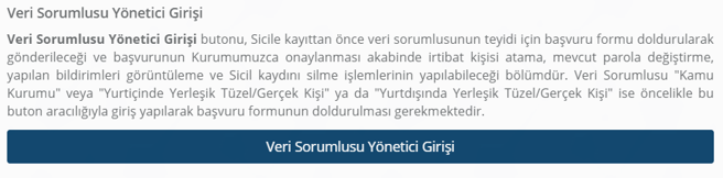 İlk olarak sisteme kayıt olunmalıdır. Web sitesine girişte “ Veri Sorumlusu Yöneticisi Girişi” butonuna tıklanarak akabinde gelen “Kayıt Olun” butonuna tıklanır.