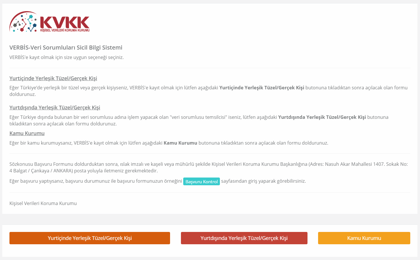 Karşımıza çıkan ekranda kayıt için uygun seçenek seçilir. Bu başvuruyu kategorilere göre ‘’Veri sorumlusu yöneticisi ya da veri sorumlusu temsilcisi veya kamu kurumlarınca belirlenen koordinasyon görevlisi istenen bilgileri girerek başvuru formunu ıslak imzalı şekilde kuruma iletilerek yapılır. Ya da kep adresinden Kurumun kep adresine göndermek yeterli olmaktadır.