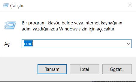 Açılan Çalıştır penceresine cmd yazıp Enter tuşuna basıyoruz.