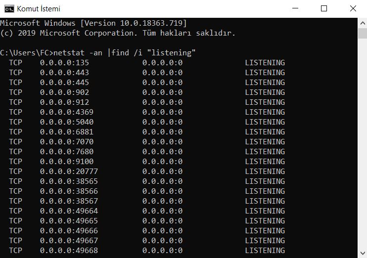 Hangi portların açık olduğunu anlamanız için, : işaretinden sonra yazılan numaraları inceleyebilirsiniz. Örneğin 0.0.0.0:5040 ile gösterilen satırda 5040 nolu port açık konumdadır.