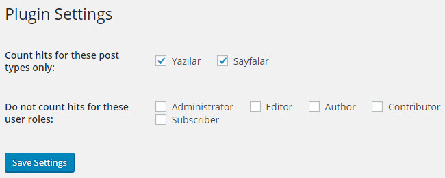Üst kısımdan Yazı ve Sayfa seçimi yaparak gösterim sayısı sütunu ekleyebilirsiniz. Alt kısımda bulunan bölümden seçim yaparak, ilk eklentide bahsettiğim gibi bu sayıların şişmesini önlemek için yönetici ve yazarların sayfa-yazı tıklamalarının toplam sayılara eklenmesini önleyebilirsiniz.