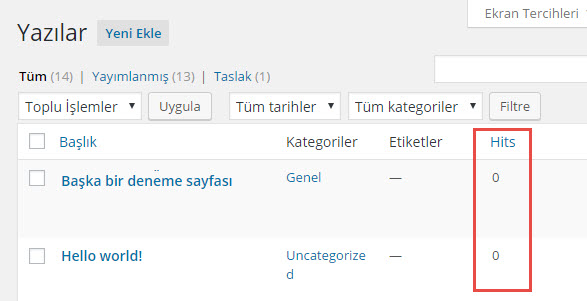 Ayarları kaydettikten sonra Yazı ve Sayfa listelemelerinde Hits adında bir sütun ve bu sütun içerisinde sayfa ve yazılarınızın görüntülenme sayılarını görebilirsiniz.