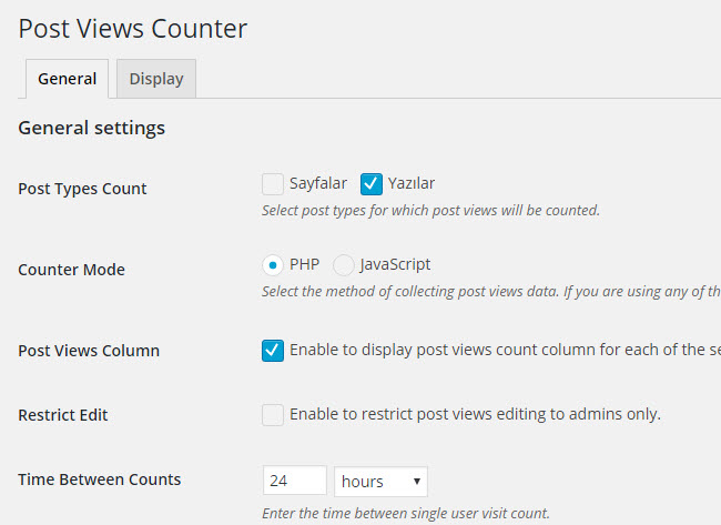 Kullanımı kolay olan Post Views Counter eklentisi ile site ziyaretçilerinize yazı ve/veya sayfalarınızın görüntülenme sayısını gösterebilirsiniz. Eklentiyi kurup etkinleştirdikten sonra Yönetici sayfanızda Ayarlar menüsünde eklentinin adını göreceksiniz ve bunu tıkladığınzda ayarları yapabileceğiniz sayfa açılacak. Burada 2 adet ayar kısmı var, birincisi General yani genel ayarlar. Bu kısımda sayfa çok uzun ve 2 resimle size yapılabilecek ayarları göstermeye çalışayım.