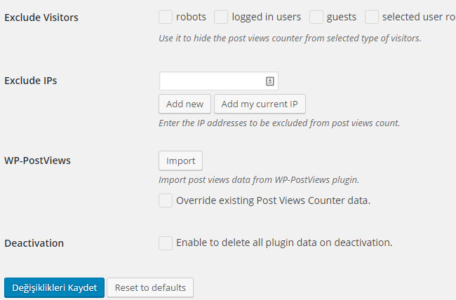 Exclude Visitors kısmından sırasıyla robotlar, giriş yapan kullanıcılar, ziyaretçiler veya seçili kullanıcılar için sayının artmasını engelleyebilirsiniz. Hemen altında bulunan Exclude IPs kısmına ekleyeceğiniz IP adreslerinden gelecek sayıları da yok sayabilirsiniz, buraya kendi IP numaranızı ekleyerek daha doğru sayılara erişebilirsiniz. WP-PostViews kısmında Import butonu tıklanarak eklenti yüklenmeden önce wordpress veritabanında tutulan sayıları eklentiye ekleyebilir ve daha önceki ziyaretçi sayıları ile başlangıç yapabilirsiniz. Son kısımda bulunan Deactivation seçili olursa eklentiyi deaktive yani silme yaptığınızda eklentiye ait tüm verilerin silinmesi sağlanır.