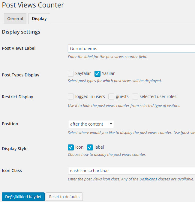 Burada ilk kısma sayıyı görüntülemeden önce bulunacak etiket başlığını gireceksiniz. İkinci kısımda ise sayıların Sayfa, Yazı veya her ikisinde de gösterimini sağlayacak seçimi yapabilirsiniz. Restrict Display kısmından gösterim sayısının bazı kullanıcılara gösterilmesini engelleyebilirsiniz. Position kısmından sayının yazılarınızda nerede görüntüleneceğinin seçimini yapacaksınız, yazının altında veya üstünde gösterme şansınız bulunmakta. Display Style bölümünden ikon ve etiket seçimi yaparak sayının öncesinde bulunmasını istediğiniz yazıyı veya ikonu seçebilirsiniz. Son olarak Icon Class kısmından gösterilecek ikonu seçin ve işlemleri kaydedin.